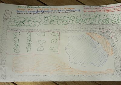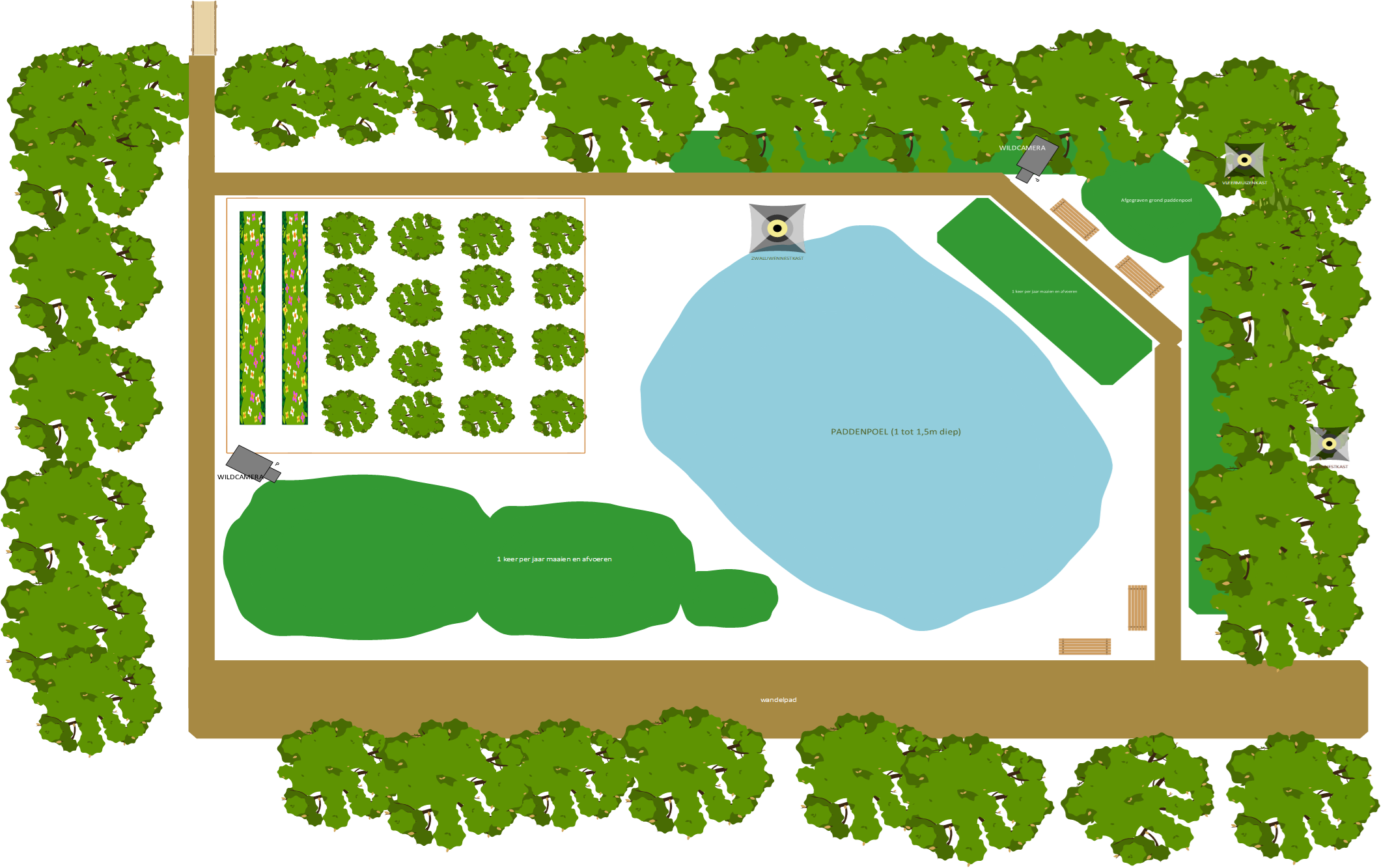Aan de rand van de paddenpoel is een zwaluwtoren voorzien, soortgelijk als in ‘t Fort aan de andere kant van het dorp. Hoog in de omringende bomen kunnen uilenkasten en vleermuiskasten worden opgehangen. Enkele wildcamera’s op strategische plaatsen kunnen een rijke bron aan extra natuureducatie leveren. Grenzend aan de fruitgaard is een griendwerkershut bedacht volgens historisch juiste specificaties. Enkele bankjes extra zijn dan nog nodig. De graspaden in het midden, aan de huizenzijde en rondom de bankjes zijn dan de enige te maaien plaatsen die overblijven. Op deze wijze denken wij in alle wensen en ideeën te voorzien. Zie ook het ontwerp op slides 5 en 6.