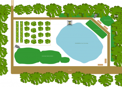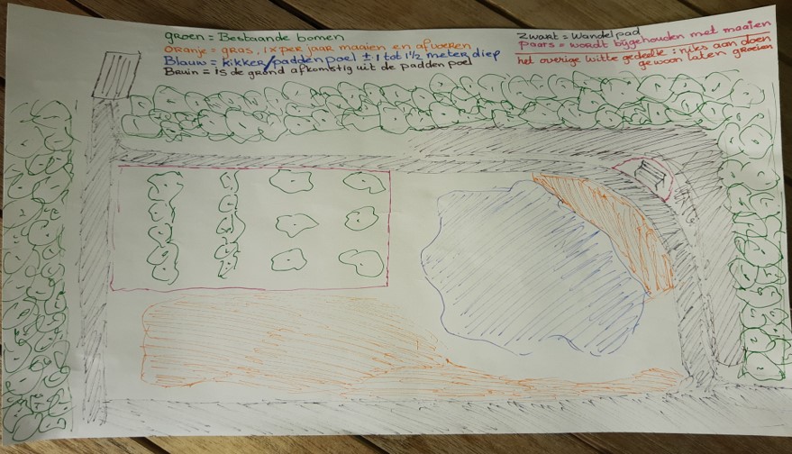 De huidige Worphoek kan een paddenpoel krijgen aan de straatzijde recht tegenover de fruitgaard. Rondom deze paddenpoel zou een verhoogd pad moeten worden aangelegd, dat doorloopt tot aan het bruggetje achter de fruitgaard, dit alles met gebruikmaking van de afgegraven grond van de paddenpoel. Tegenover de fruitgaard aan de huizenzijde wordt de ruimte bestemd voor vrije groei van bomen, struiken en wilde bloemen. Langs de huizenzijde blijft een graspad als brandgang. Hiermee blijft het ook beeld van weidsheid en diepte vanaf het toegangspad intact.